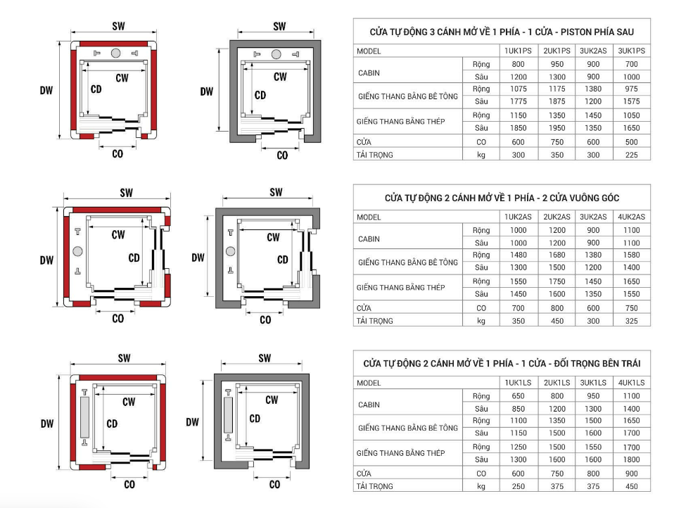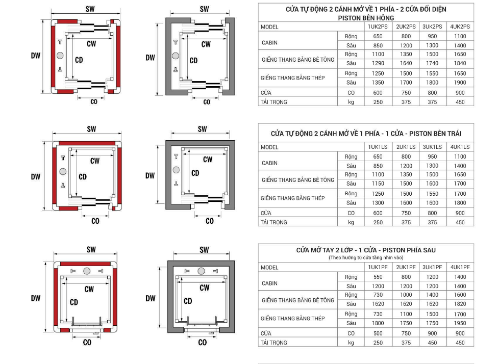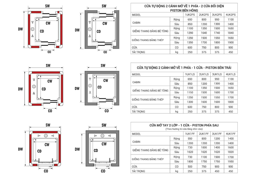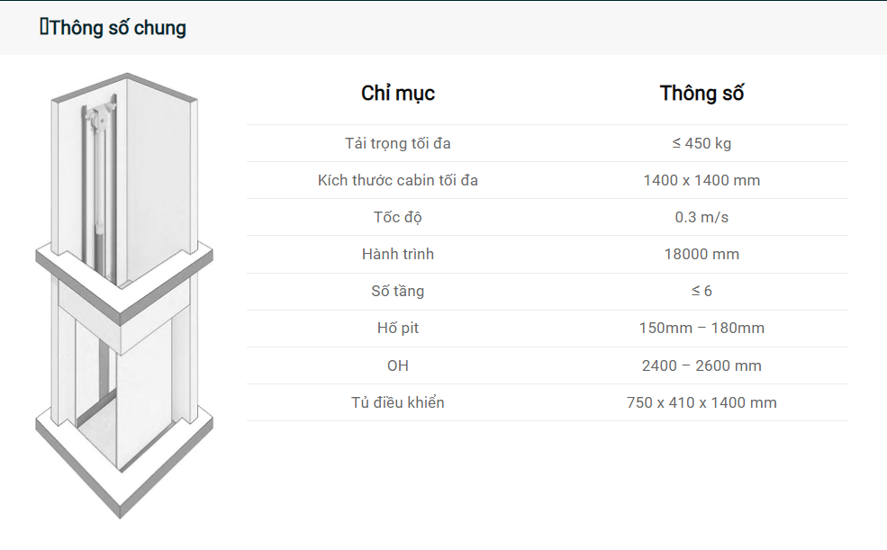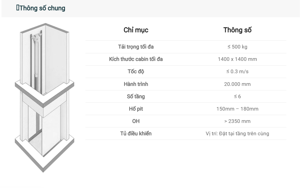 - Kích thước giếng thang: 975 mm x 900 mm (giếng bê tông) và 1050 x 1000 mm (giếng thép)