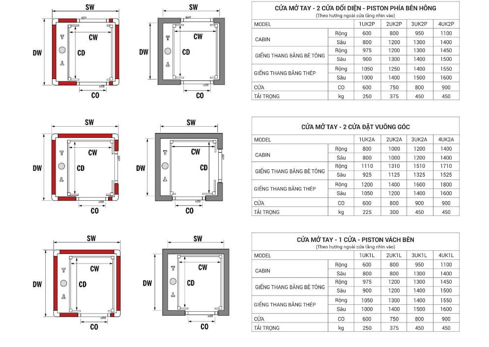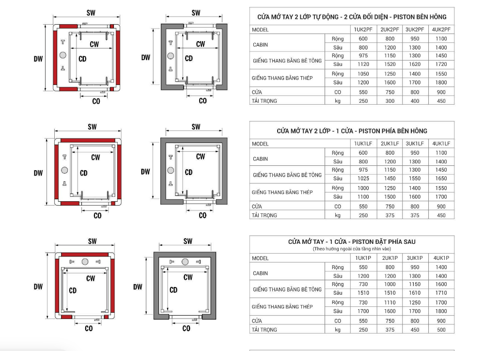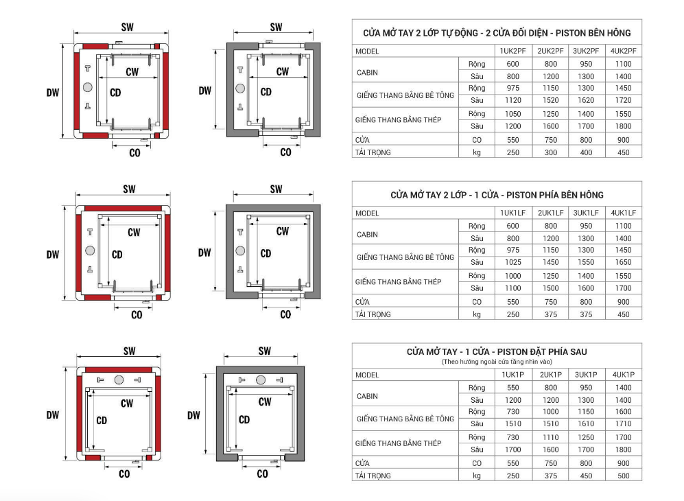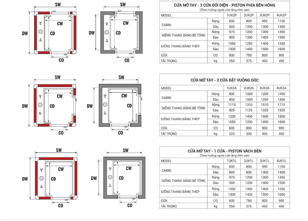 - Kích thước giếng thang: 975 mm x 900 mm (giếng bê tông) và 1050 x 1000 mm (giếng thép)