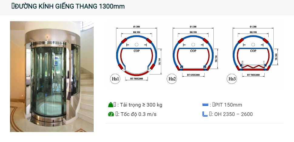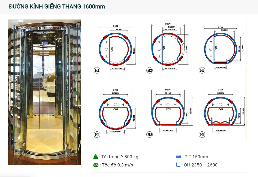 - Kích thước giếng thang: từ 1300 mm x 1400 mm (giếng bê tông) và 1400 x 1500 mm (giếng thép)